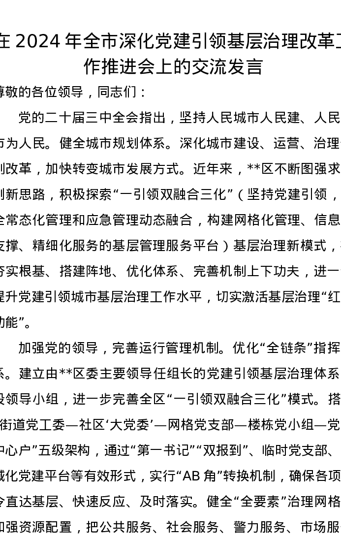 在2024年全市深化党建引领基层治理改革工作推进会上的交流发言