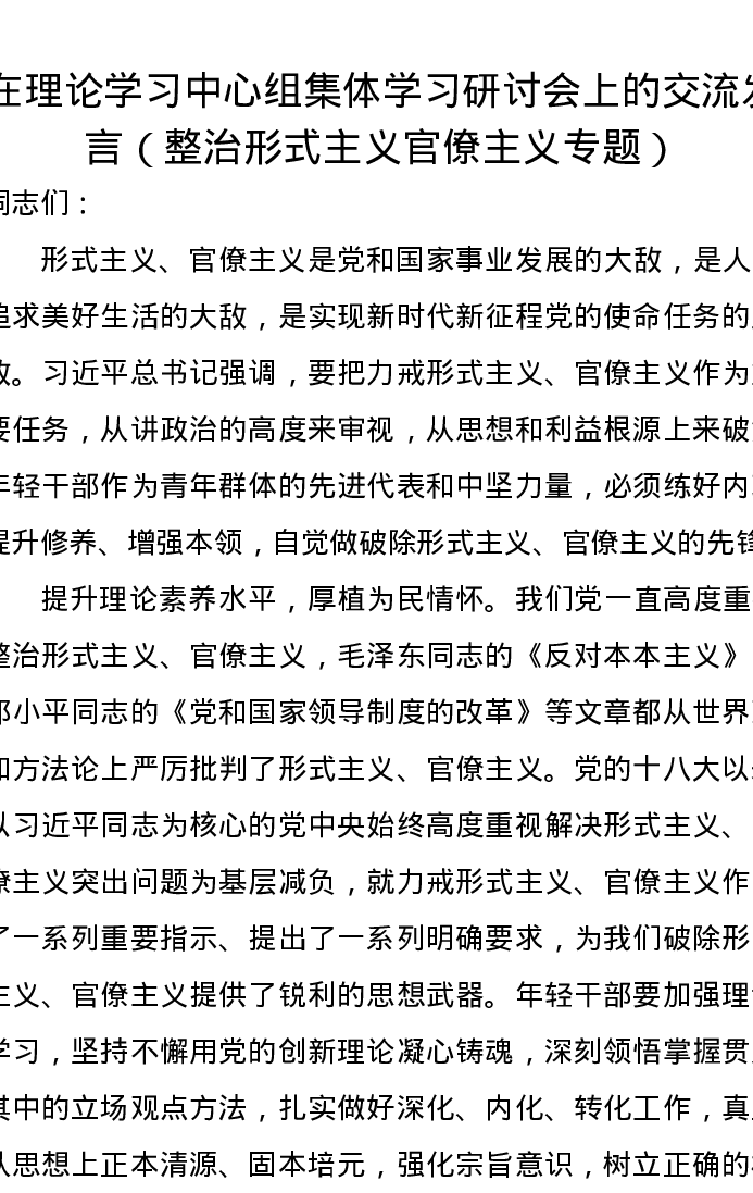 在理论学习中心组集体学习研讨会上的交流发言(整治形式主义官僚主义专题)