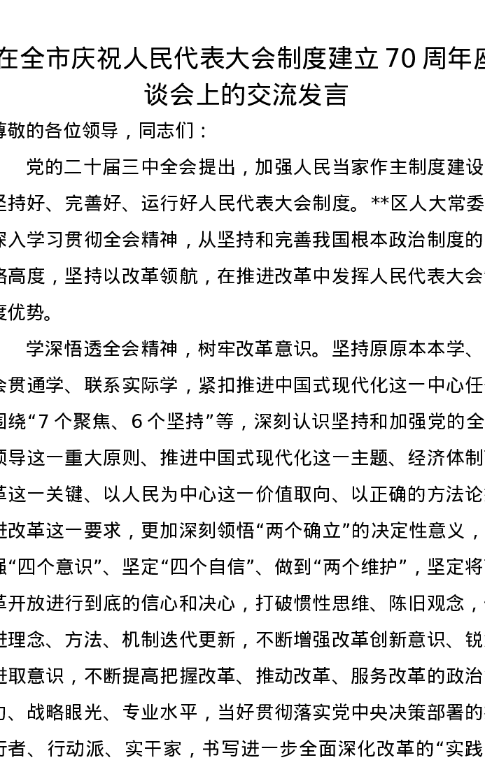 在全市庆祝人民代表大会制度建立70周年座谈会上的交流发言