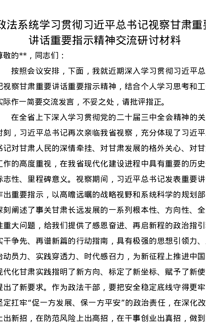 政法系统学习贯彻习近平总书记视察甘肃重要讲话重要指示精神交流研讨材料