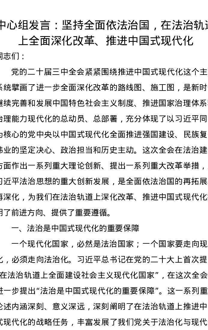 中心组发言:坚持全面依法治国,在法治轨道上全面深化改革、推进中国式现代化