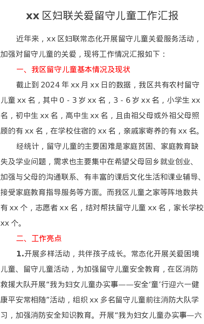 xx区妇联关爱留守儿童工作汇报