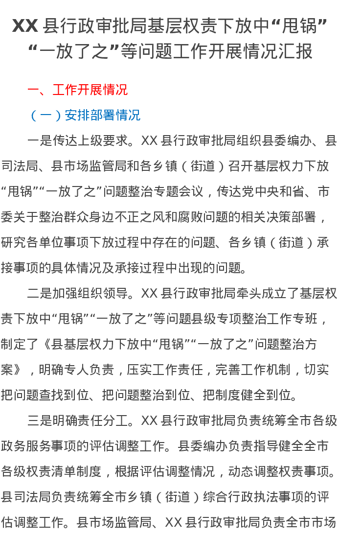XX县行政审批局基层权责下放中“甩锅”“一放了之”等问题工作开展情况汇报
