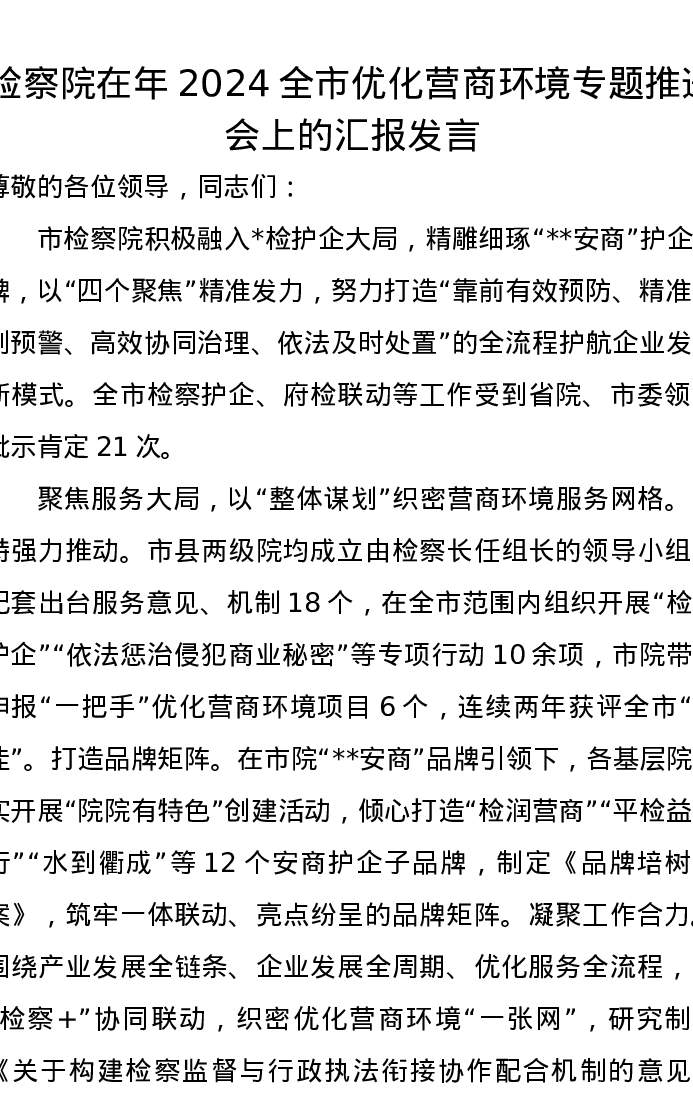 检察院在年2024全市优化营商环境专题推进会上的汇报发言