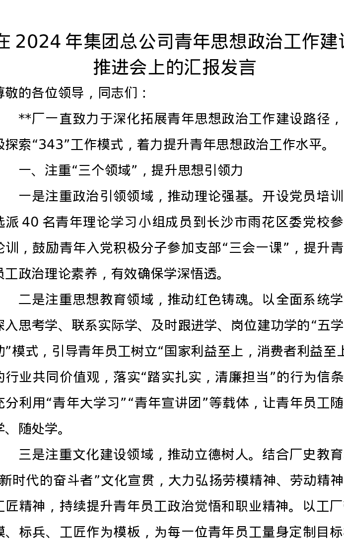 在2024年集团总公司青年思想政治工作建设推进会上的汇报发言