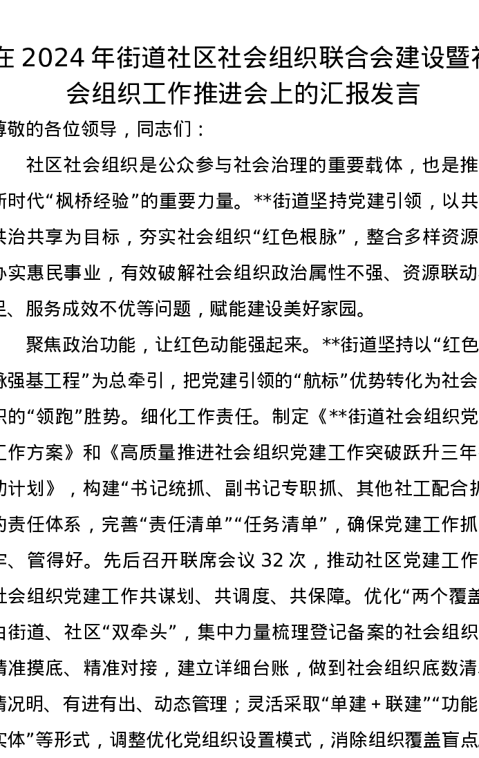 在2024年街道社区社会组织联合会建设暨社会组织工作推进会上的汇报发言