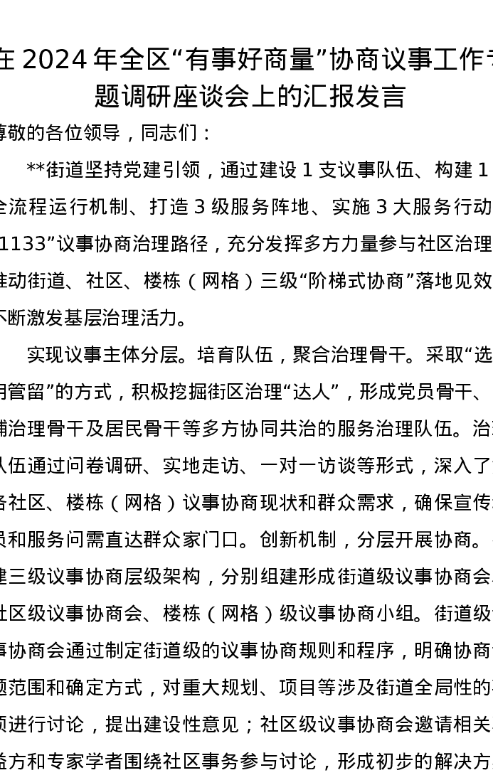 在2024年全区“有事好商量”协商议事工作专题调研座谈会上的汇报发言