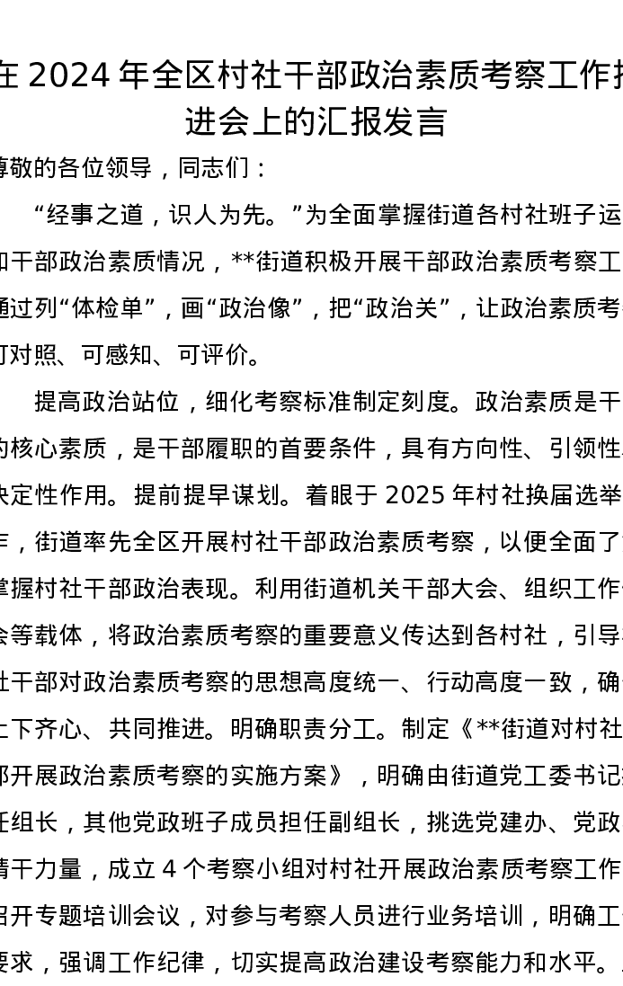 在2024年全区村社干部政治素质考察工作推进会上的汇报发言