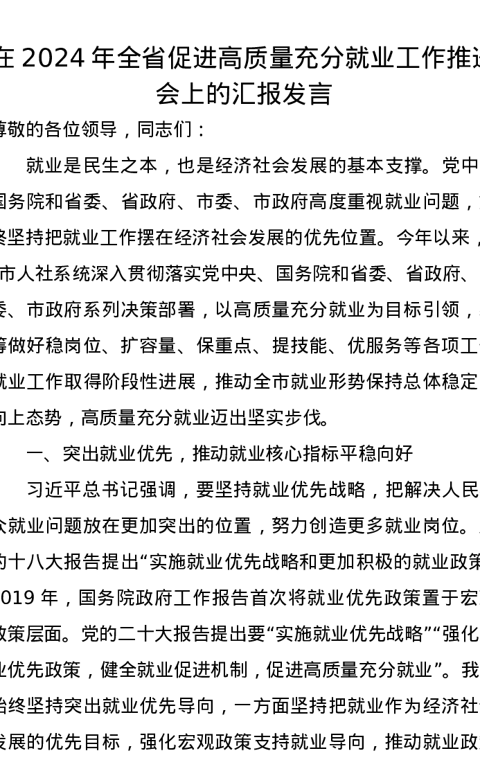 在2024年全省促进高质量充分就业工作推进会上的汇报发言