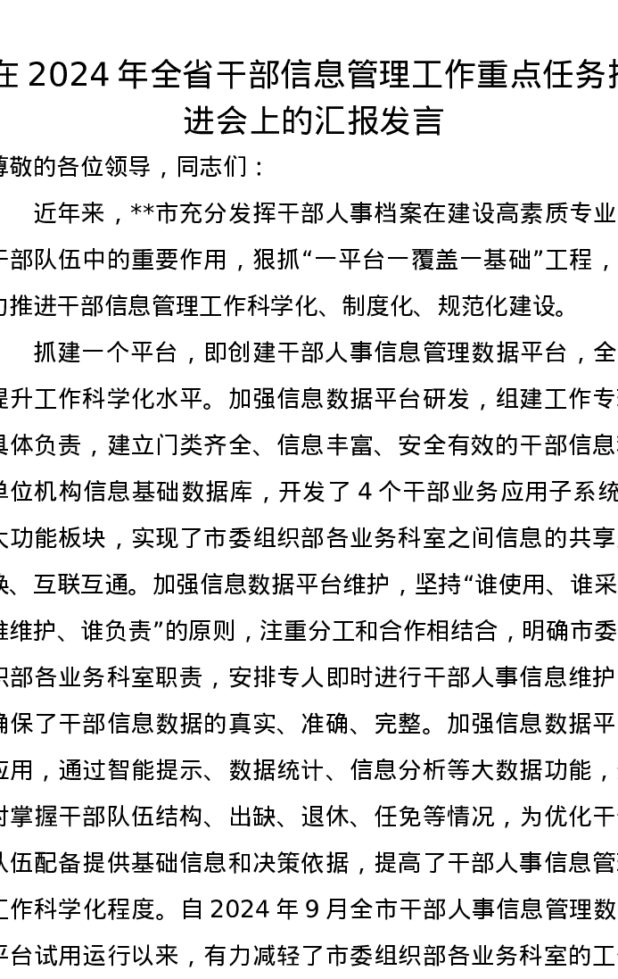 在2024年全省干部信息管理工作重点任务推进会上的汇报发言