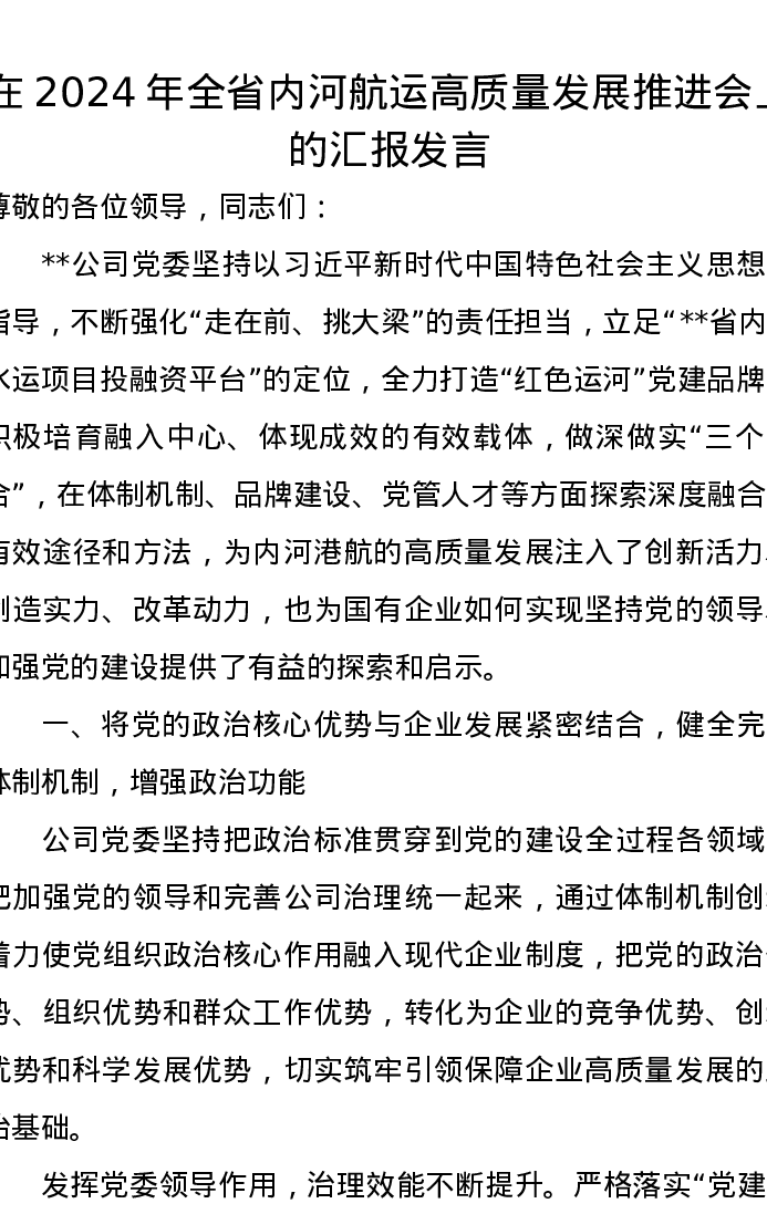 在2024年全省内河航运高质量发展推进会上的汇报发言