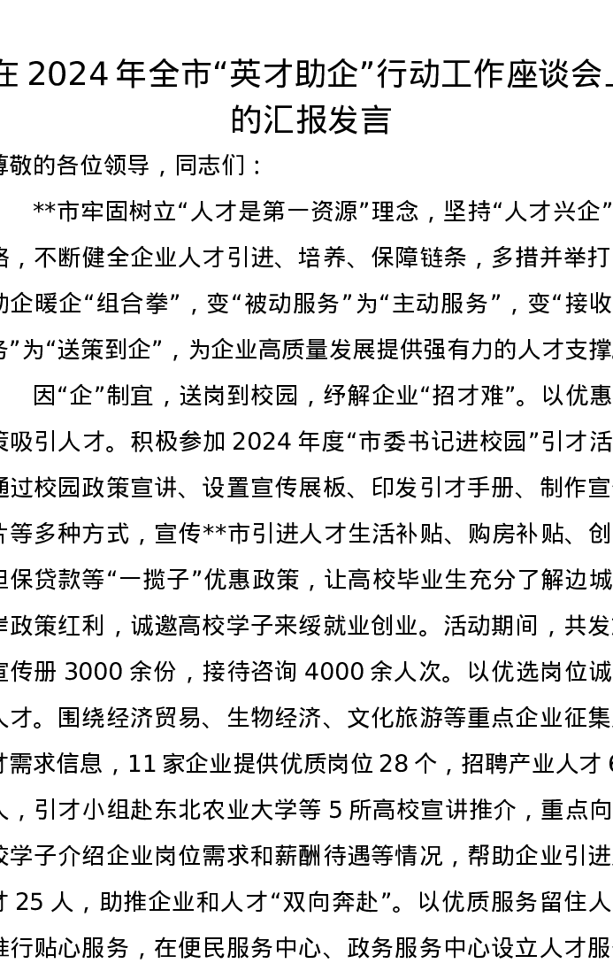 在2024年全市“英才助企”行动工作座谈会上的汇报发言