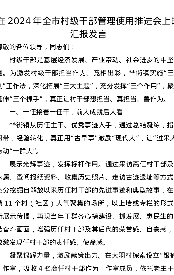 在2024年全市村级干部管理使用推进会上的汇报发言