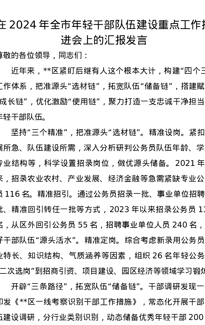 在2024年全市年轻干部队伍建设重点工作推进会上的汇报发言
