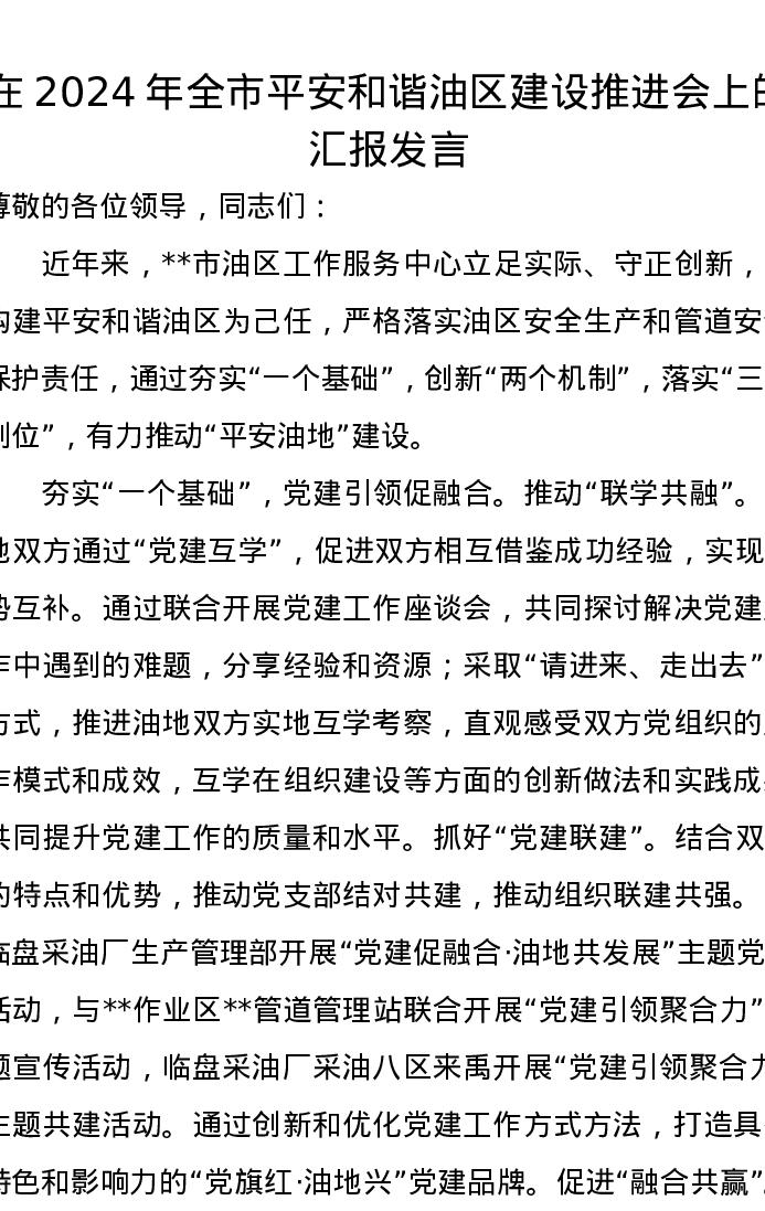 在2024年全市平安和谐油区建设推进会上的汇报发言