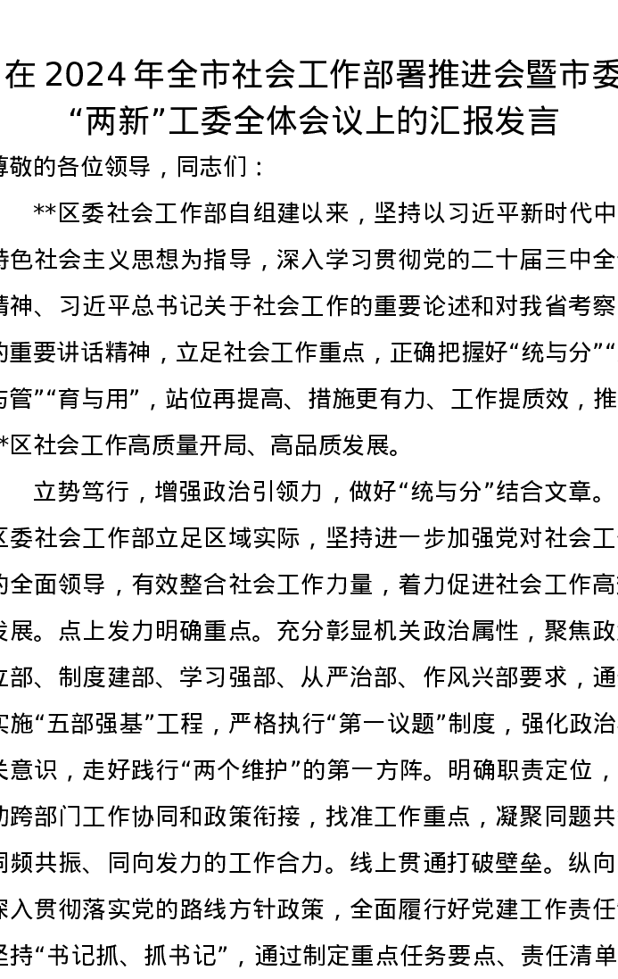 在2024年全市社会工作部署推进会暨市委“两新”工委全体会议上的汇报发言