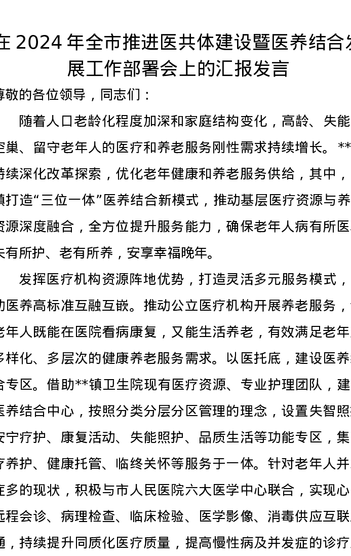 在2024年全市推进医共体建设暨医养结合发展工作部署会上的汇报发言