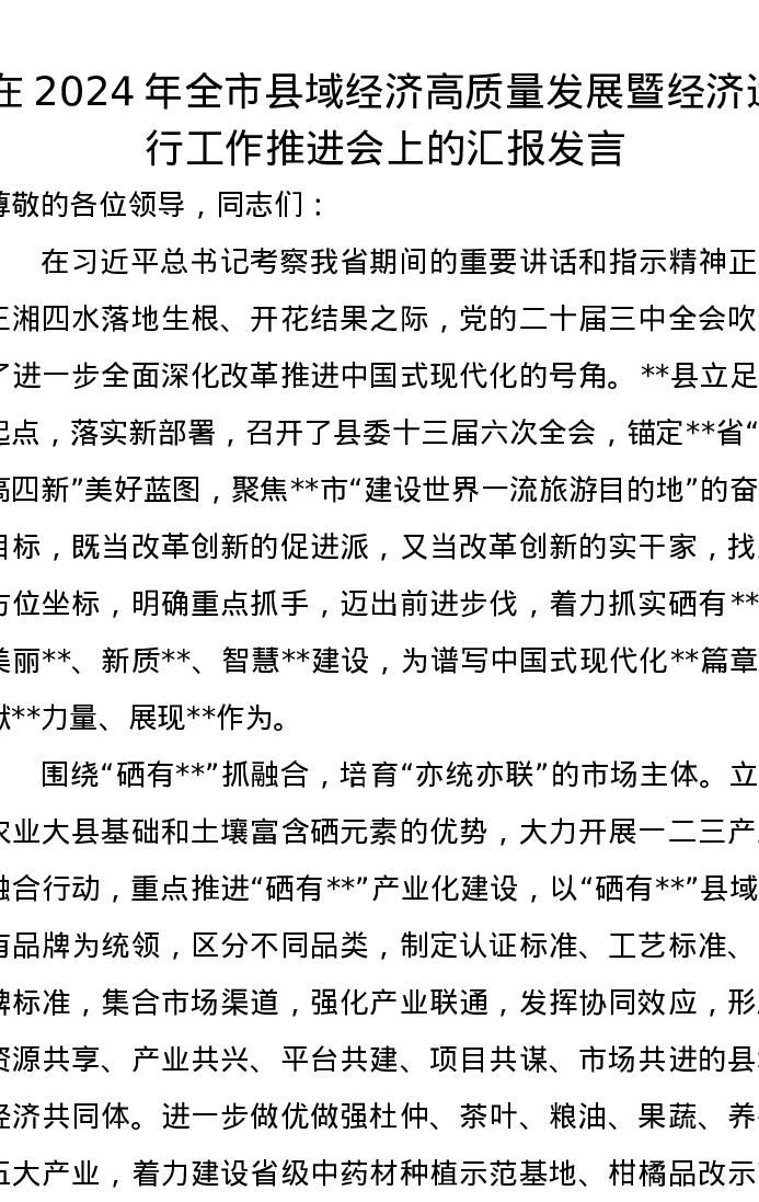 在2024年全市县域经济高质量发展暨经济运行工作推进会上的汇报发言
