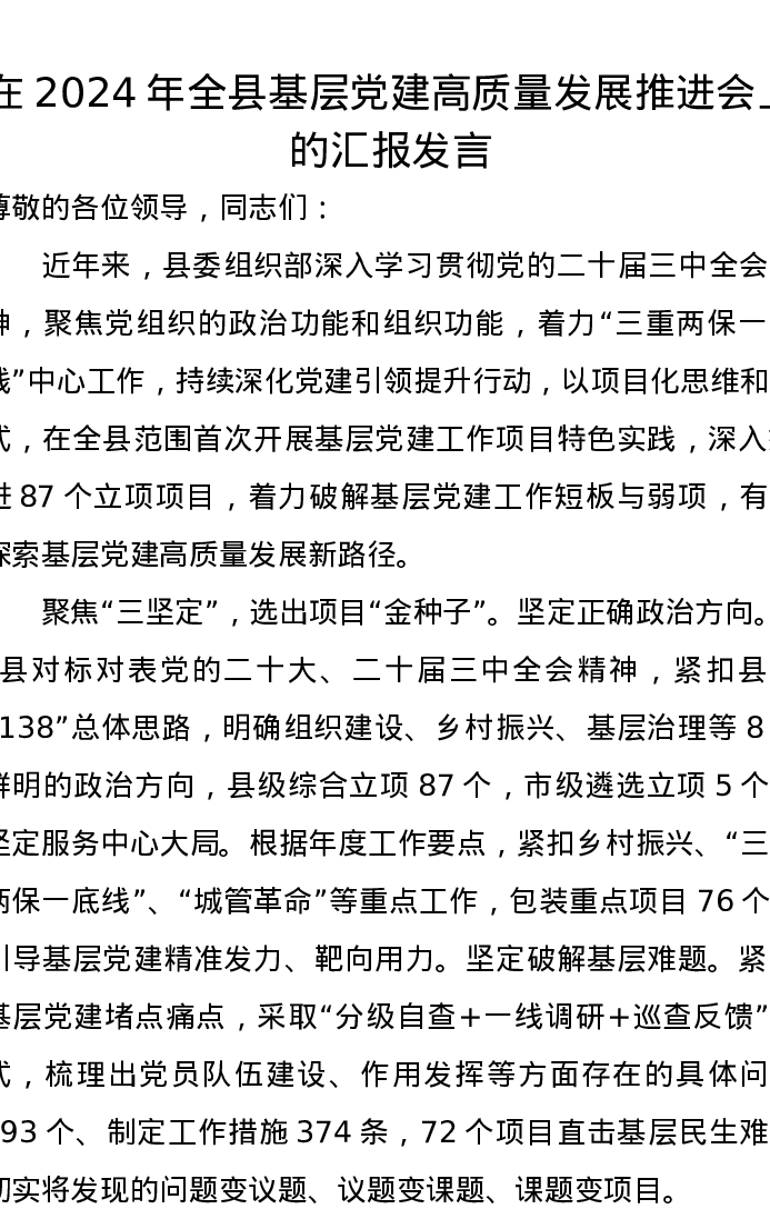 在2024年全县基层党建高质量发展推进会上的汇报发言