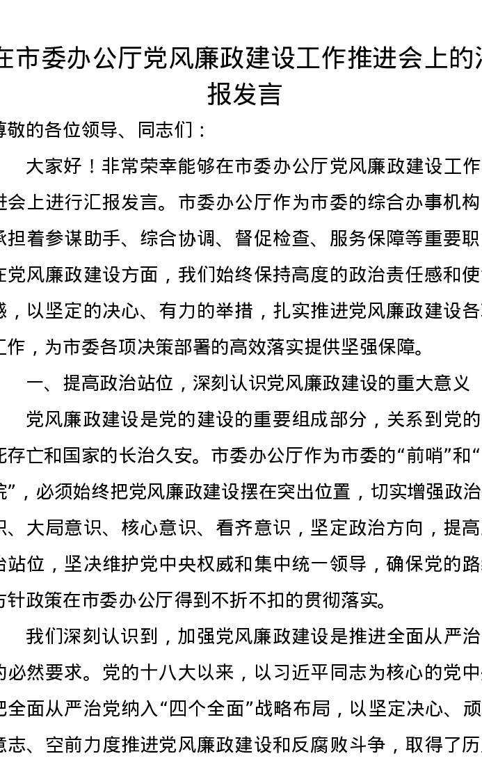 在市委办公厅党风廉政建设工作推进会上的汇报发言