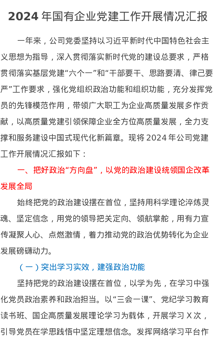 2024年国有企业党建工作开展情况汇报