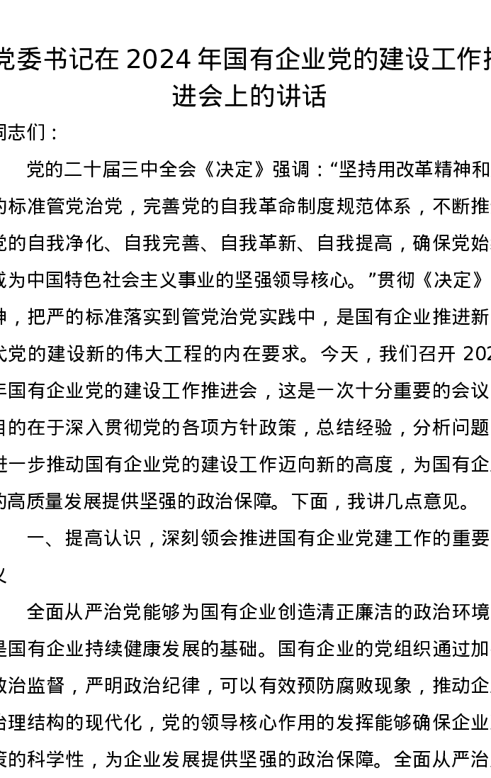 党委书记在2024年国有企业党的建设工作推进会上的讲话