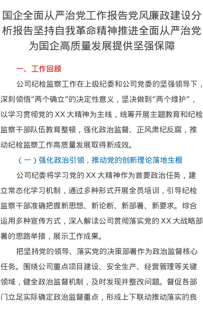 国企全面从严治党工作报告党风廉政建设分析报告坚持自我革命精神推进全面从严治党为国企高质量发展提供坚强保障