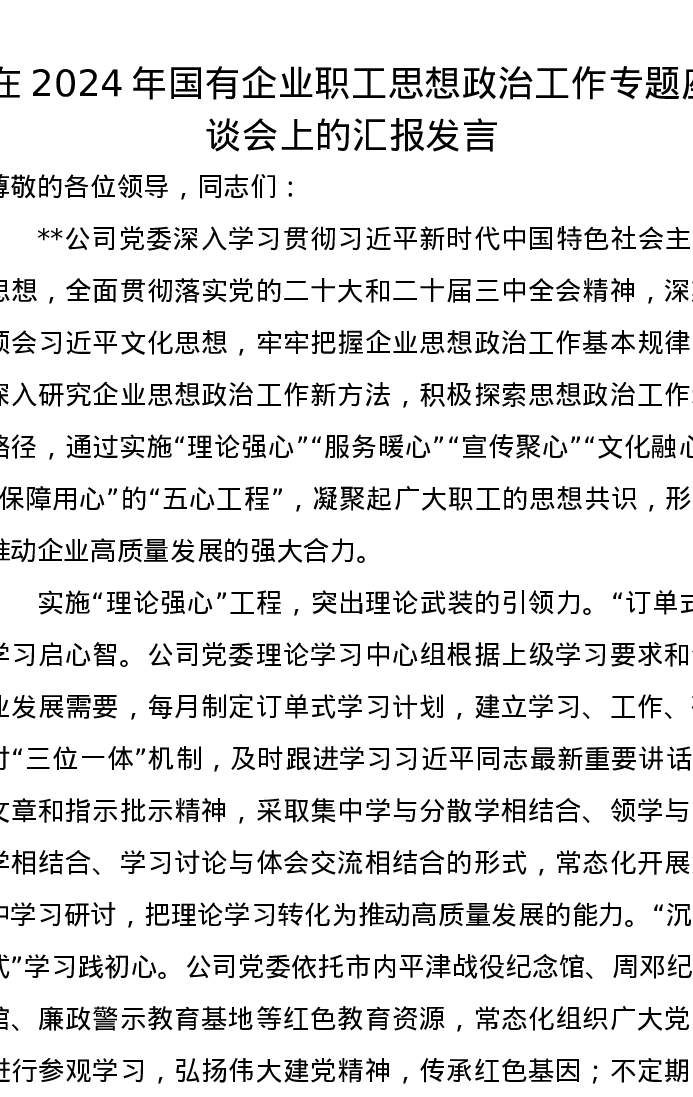 在2024年国有企业职工思想政治工作专题座谈会上的汇报发言