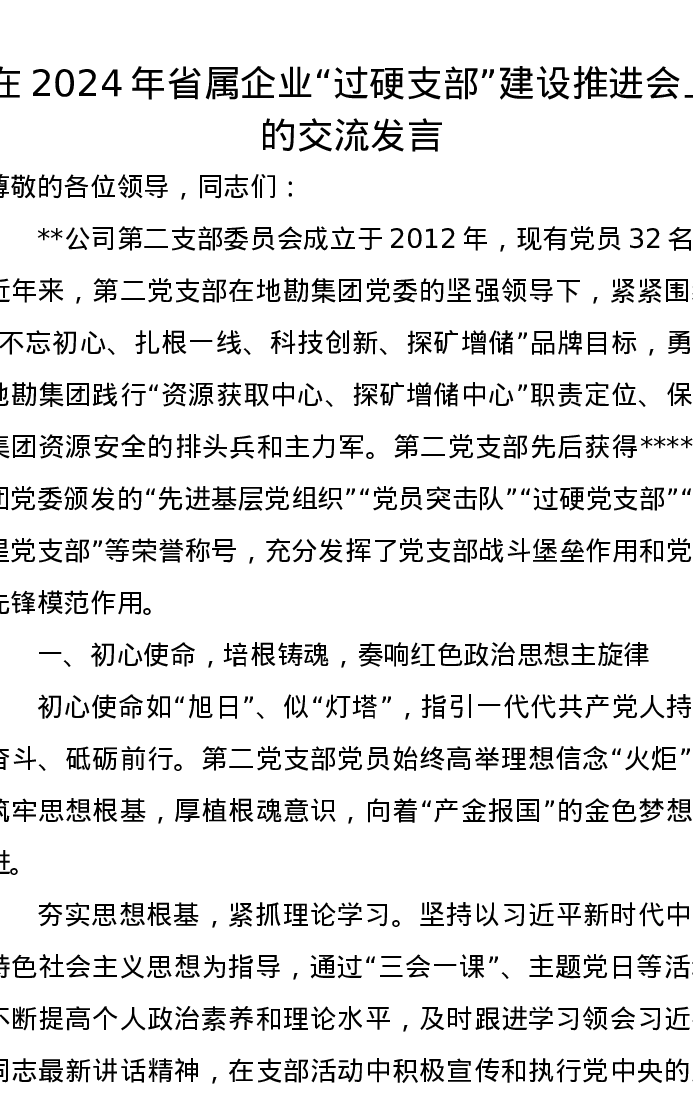 在2024年省属企业“过硬支部”建设推进会上的交流发言