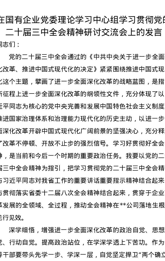在国有企业党委理论学习中心组学习贯彻党的二十届三中全会精神研讨交流会上的发言