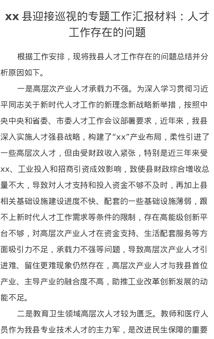 xx县迎接巡视的专题工作汇报材料:人才工作存在的问题
