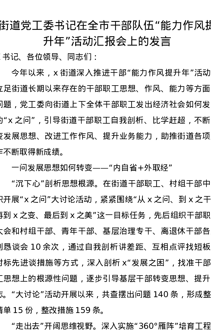 街道党工委书记在全市干部队伍“能力作风提升年”活动汇报会上的发言