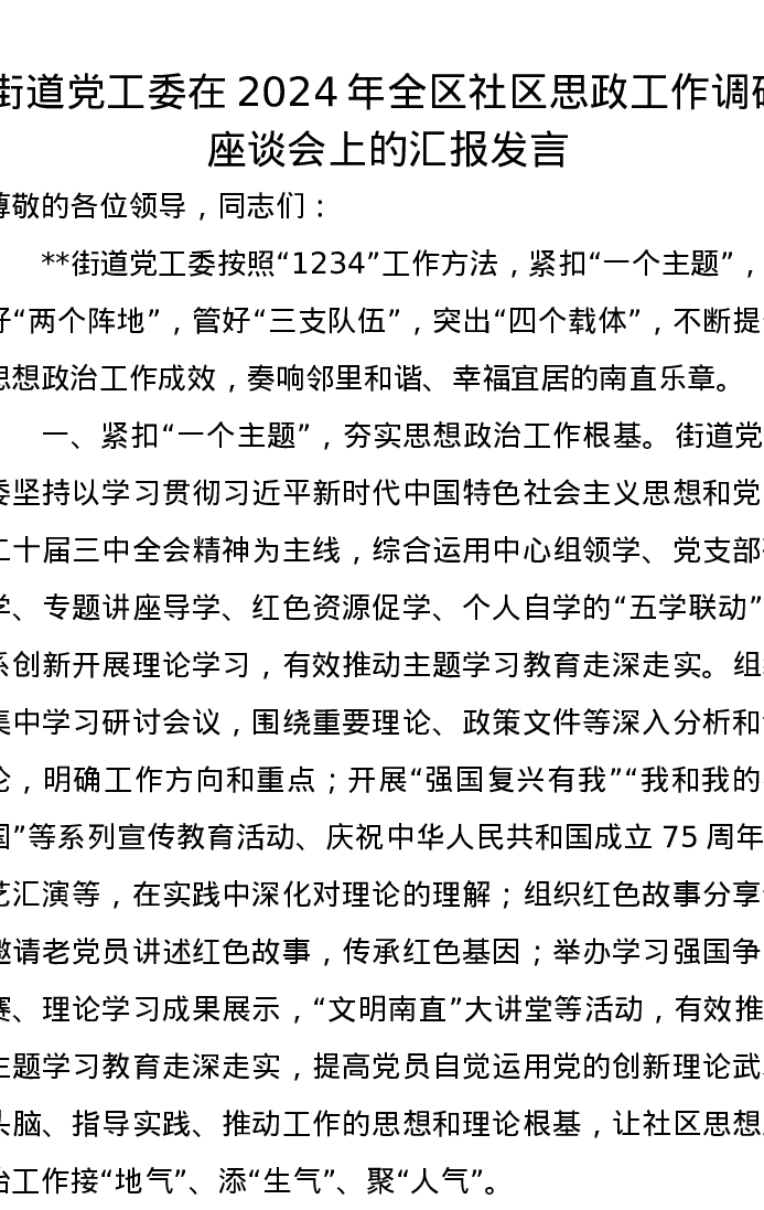 街道党工委在2024年全区社区思政工作调研座谈会上的汇报发言