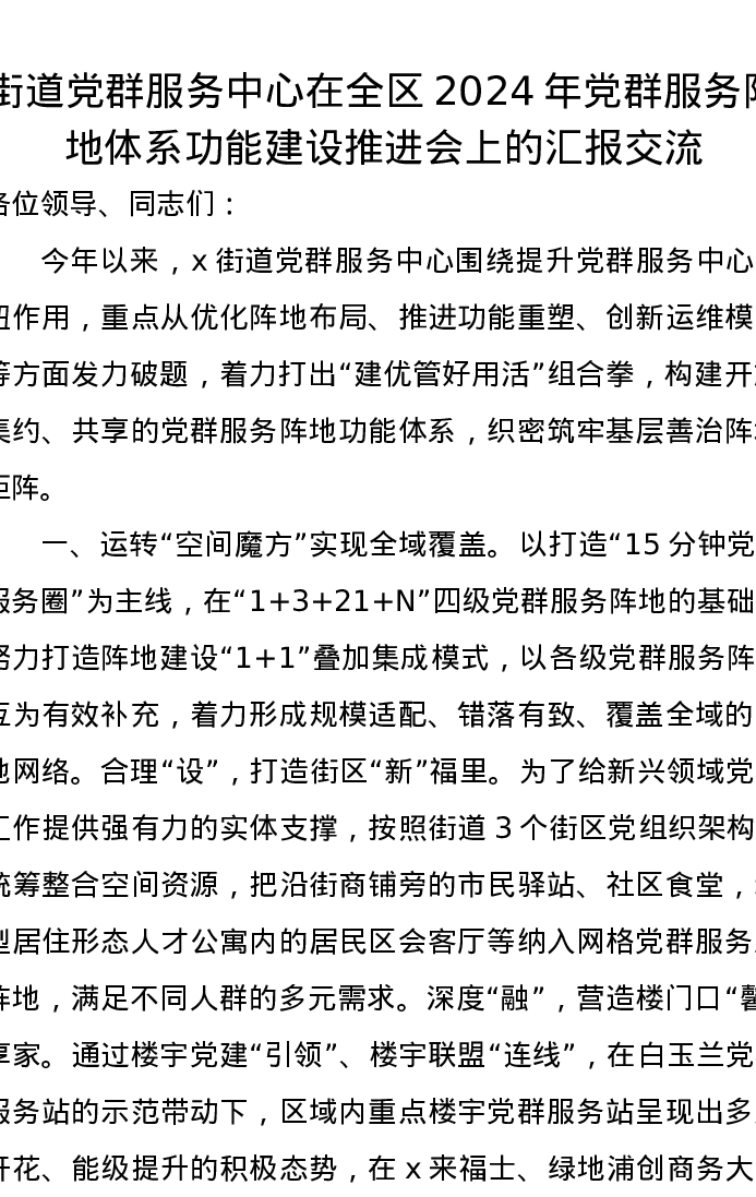 街道党群服务中心在全区2024年党群服务阵地体系功能建设推进会上的汇报交流