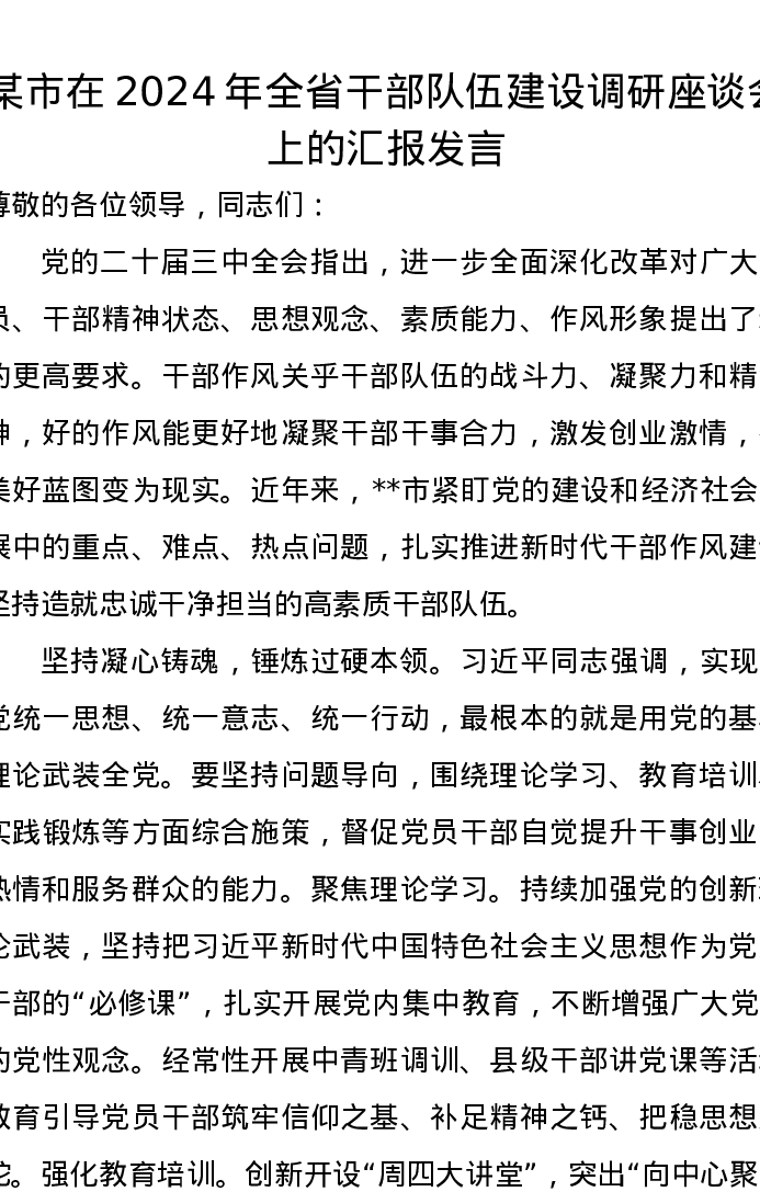 某市在2024年全省干部队伍建设调研座谈会上的汇报发言