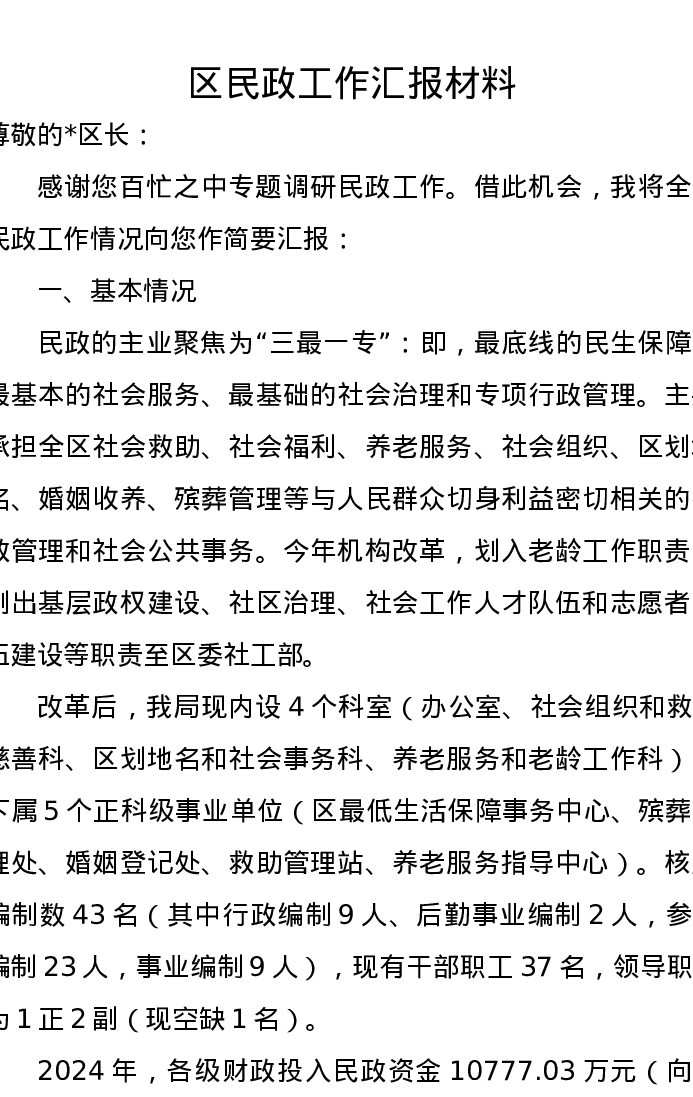 区民政工作汇报材料