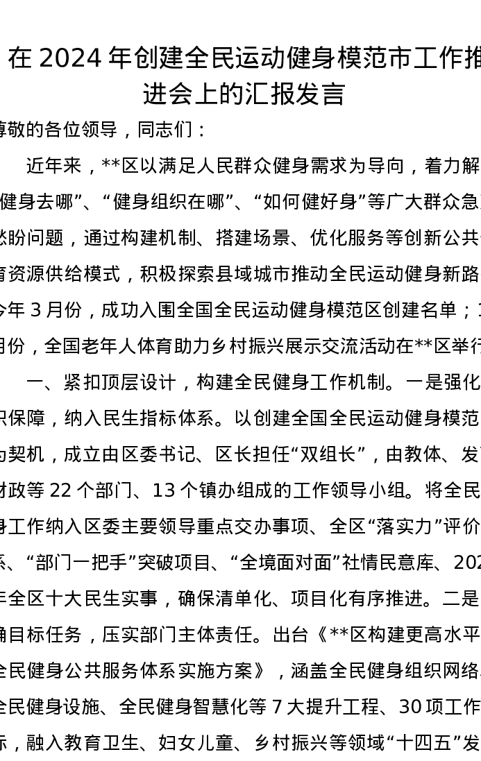在2024年创建全民运动健身模范市工作推进会上的汇报发言