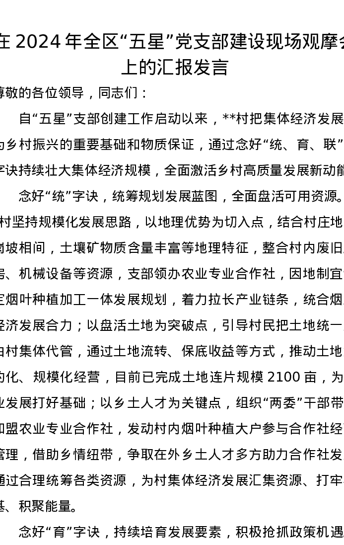 在2024年全区“五星”党支部建设现场观摩会上的汇报发言