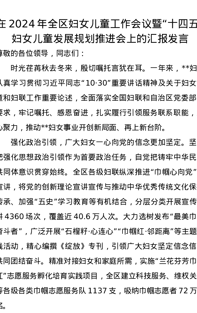 在2024年全区妇女儿童工作会议暨“十四五”妇女儿童发展规划推进会上的汇报发言