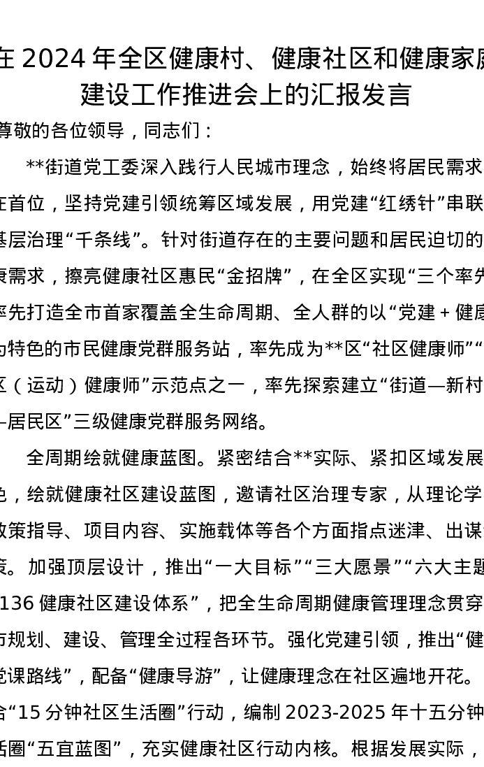 在2024年全区健康村、健康社区和健康家庭建设工作推进会上的汇报发言