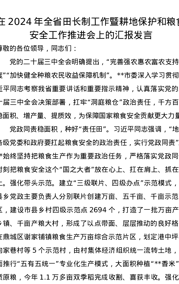 在2024年全省田长制工作暨耕地保护和粮食安全工作推进会上的汇报发言