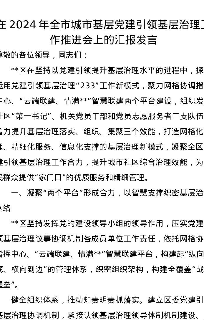 在2024年全市城市基层党建引领基层治理工作推进会上的汇报发言