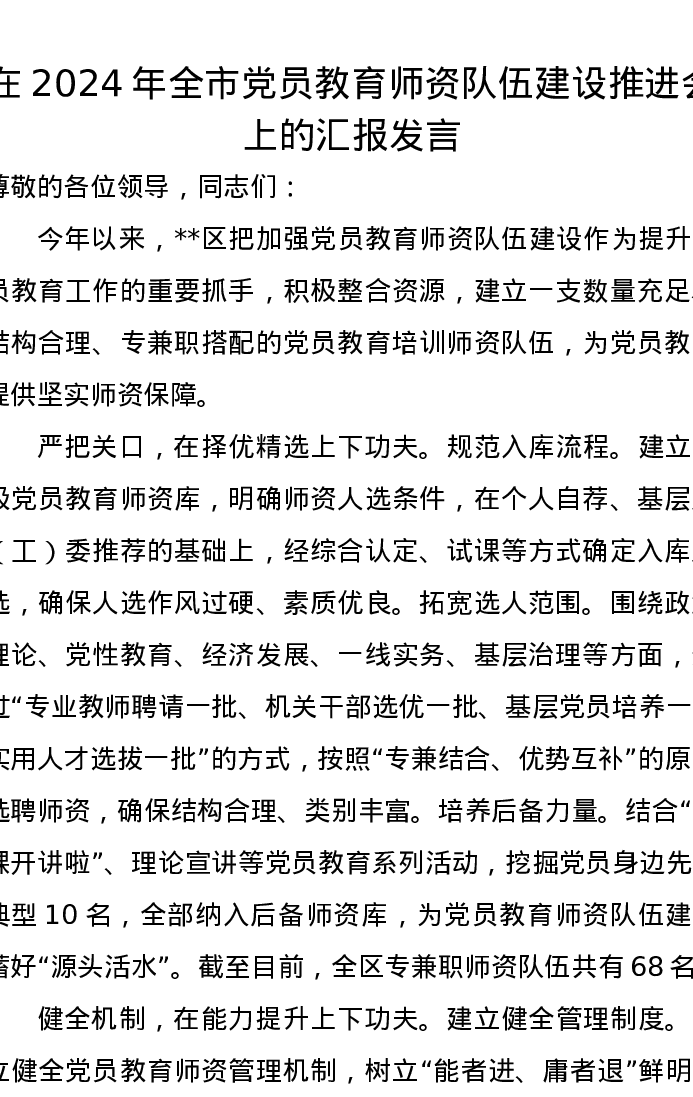 在2024年全市党员教育师资队伍建设推进会上的汇报发言
