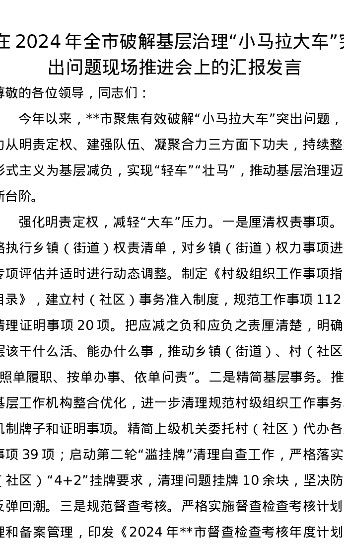 在2024年全市破解基层治理“小马拉大车”突出问题现场推进会上的汇报发言