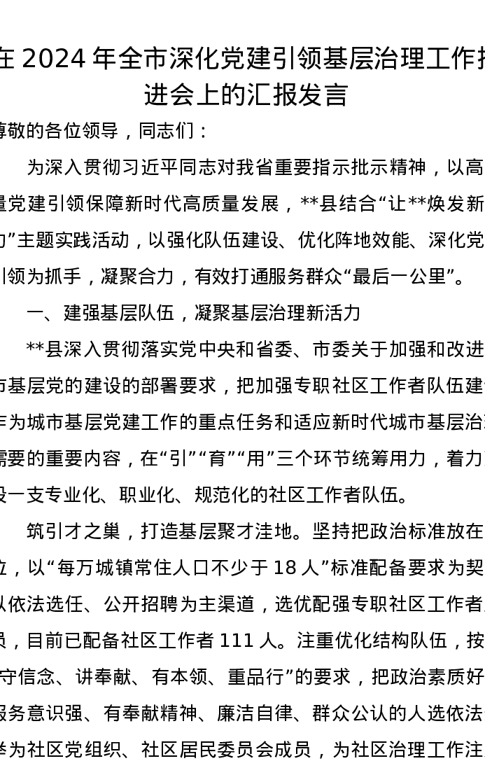 在2024年全市深化党建引领基层治理工作推进会上的汇报发言