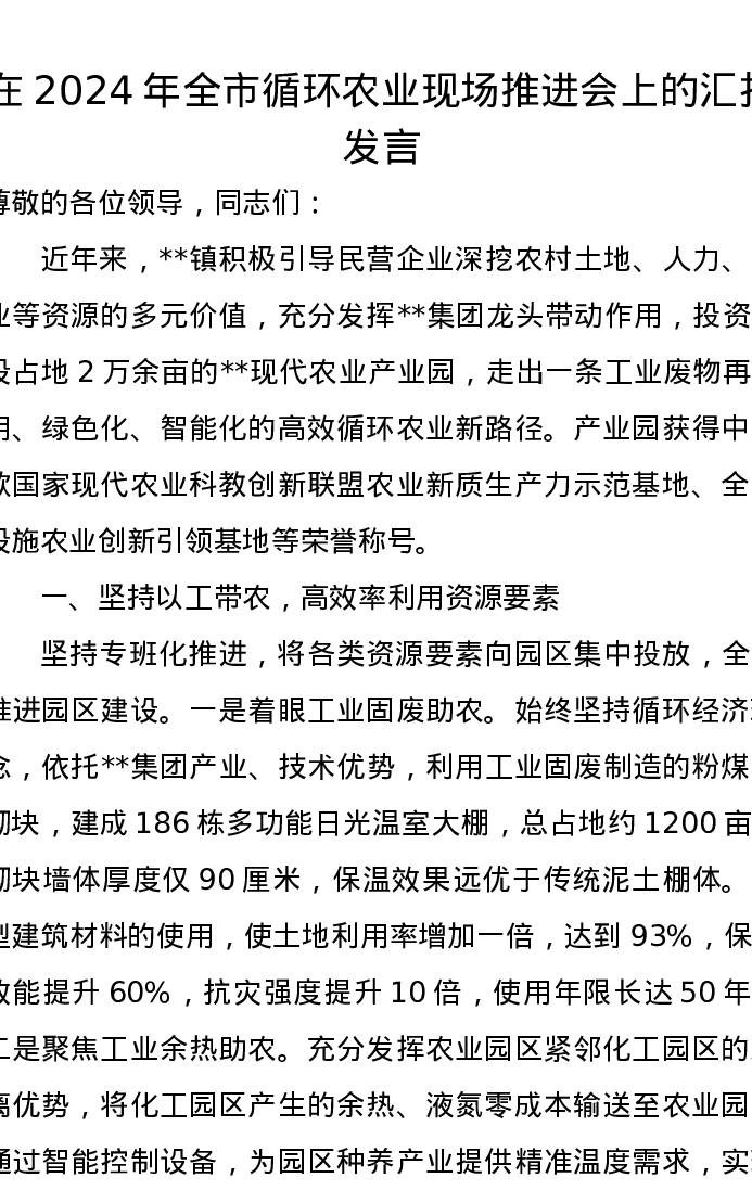在2024年全市循环农业现场推进会上的汇报发言
