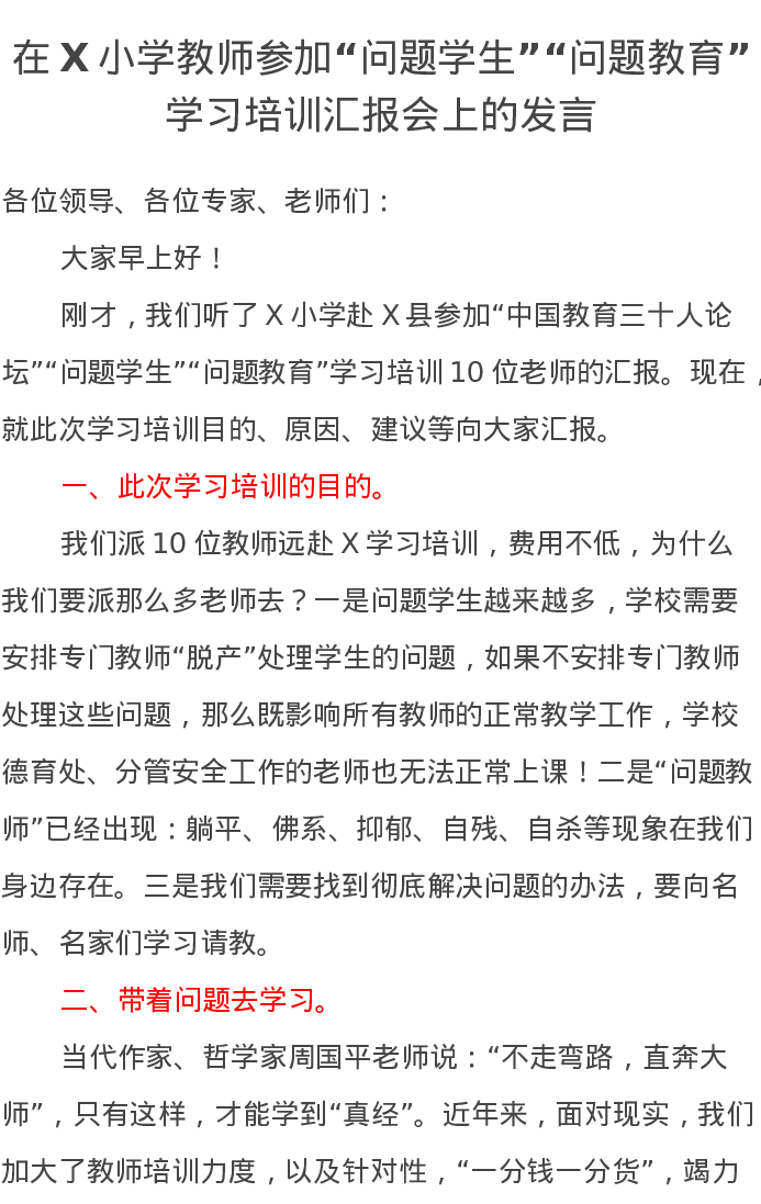 在X小学教师参加“问题学生”“问题教育”学习培训汇报会上的发言