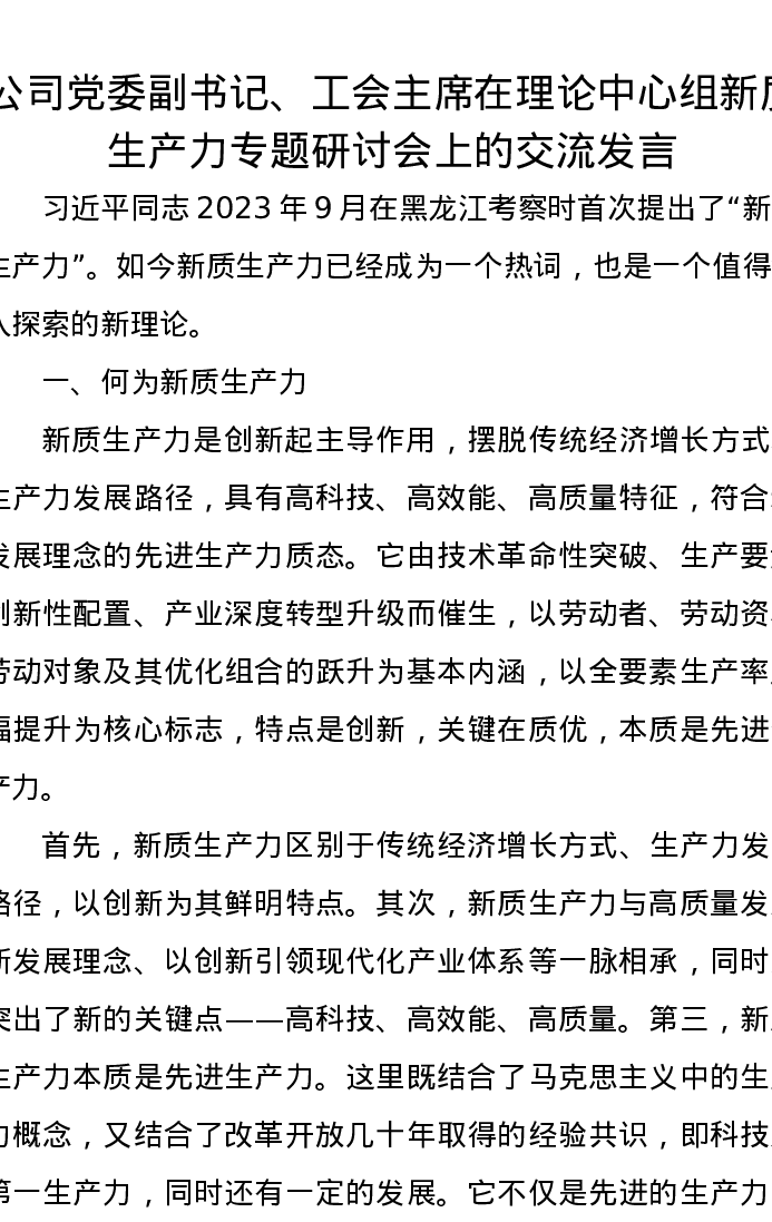 公司党委副书记、工会主席在理论中心组新质生产力专题研讨会上的交流发言