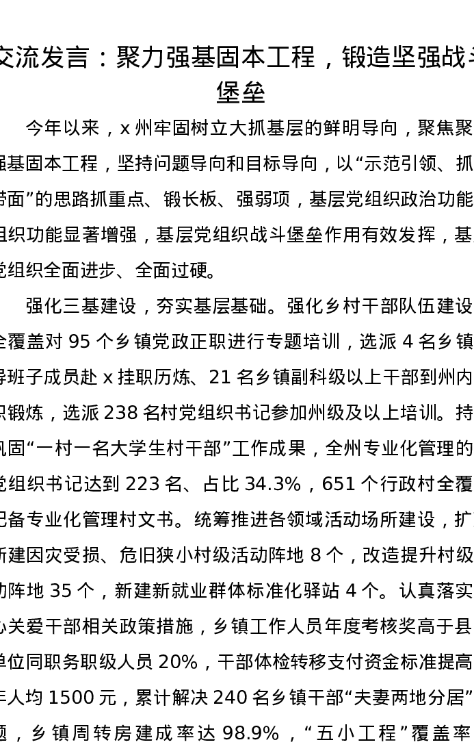 交流发言:聚力强基固本工程,锻造坚强战斗堡垒