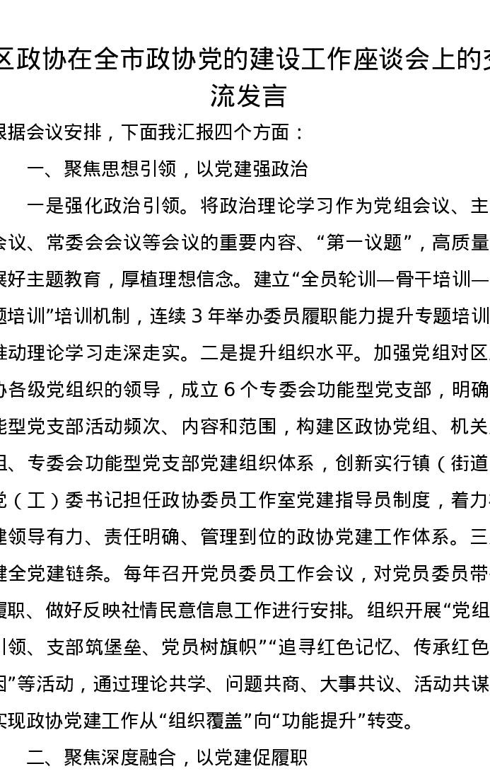 区政协在全市政协党的建设工作座谈会上的交流发言